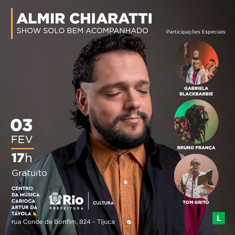 O Centro da Música Carioca Artur da Távola será palco, no dia 3 de fevereiro, de um espetáculo onde a música é o fio condutor que leva à poesia e dança. O cantor e compositor Almir Chiaratti traz um show multilinguagem faz uma narrativa musical não-linear, com intervenções de poemas, danças e performances costurando o repertório, a partir das 17h. As entradas são gratuitas.
