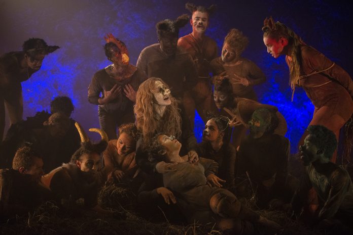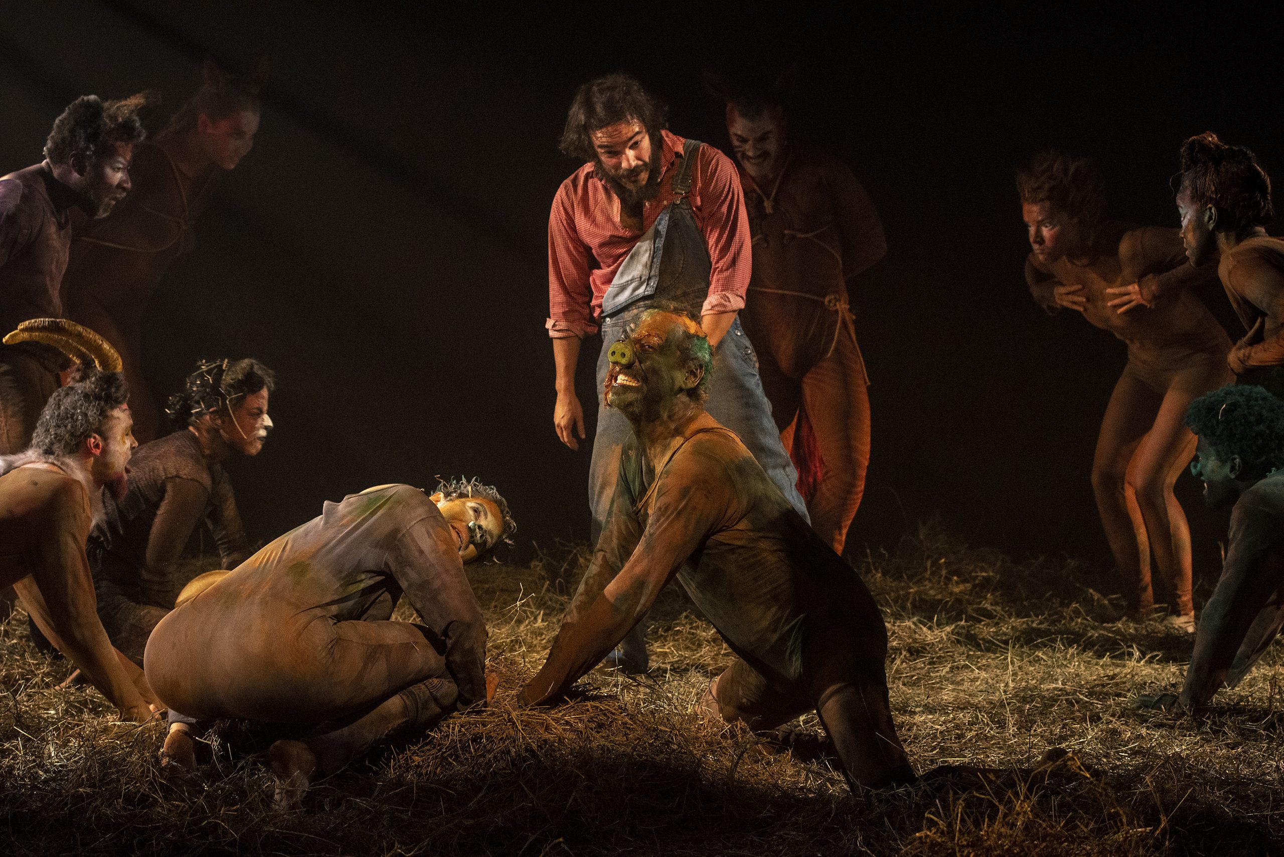São muitos artistas, vale dizer que cada um fez seu trabalho com precisão, as atrizes que levaram as galinhas ao palco estavam ótimas, com todos os movimentos e olhares. Os carneiros, que pareciam teleguiados o tempo inteiro, e evidenciam o que acontece com a sociedade, que defende cegamente um fascismo abominável. O movimento do corvo é um transbordo cênico, traduz o que são trabalhos de cena e corpo impecáveis. Os cachorros, todos estão perfeitos, “abanam os bumbuns” porque não têm rabos, os olhares e línguas atuam magicamente. Trata-se de um elenco agressivo, quando se percebe tantas atuações arrebatadoras. As vacas/atrizes mugem sem leviandade. Todos belíssimos!
