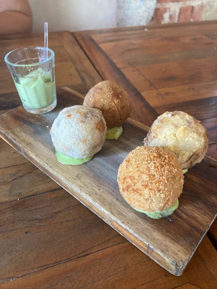 A cultura nordestina não é enaltecida apenas na decoração, mas também na música ambiente e nos pratos. Para começar, dividi com minha namorada o SPC (R$38), uma degustação dos 4 bolinhos da casa. Os bolinhos que vinham nessa degustação eram: Jabá com Jerimum (Abóbora com carne seca empanado na tapioca), Vaca Louca (Costela com aipim na farinha de pão), Rabicó (Rabada com batata e agrião) e o Portuga (Bacalhau com grão de bico na Panko). O de Jabá com Jerimum era o mais gostoso, com gosto bem presente de carne seca. O Rabicó era um pouco mais gorduroso por conta da rabada e com isso um pouco mais enjoativo. O Vaca Louca era bem gostoso e crocante. De todos os bolinhos, o que infelizmente não me agradou tanto foi o Portuga, onde a textura do grão de bico não era algo tão agradável na boca, além de estar um pouco sem sal. Os petiscos dessa degustação vinham com uma maionese verde temperada bem gostosa. Porém, todos já vinham com um pouco do molho à mesa, impossibilitando que quem não goste de molho, experimente o bolinho sem o mesmo. A entrada seguinte foi o croquete de carne (R$35), que era de um bom preço pelo tamanho e quantidade ofertada. Os 6 croquetes da porção vieram bem crocantes e fritos, com um recheio bem carnudo. De prato principal experimentei a versão vegetariana do tradicional prato brasileiro, Baião de Dois (R$38).