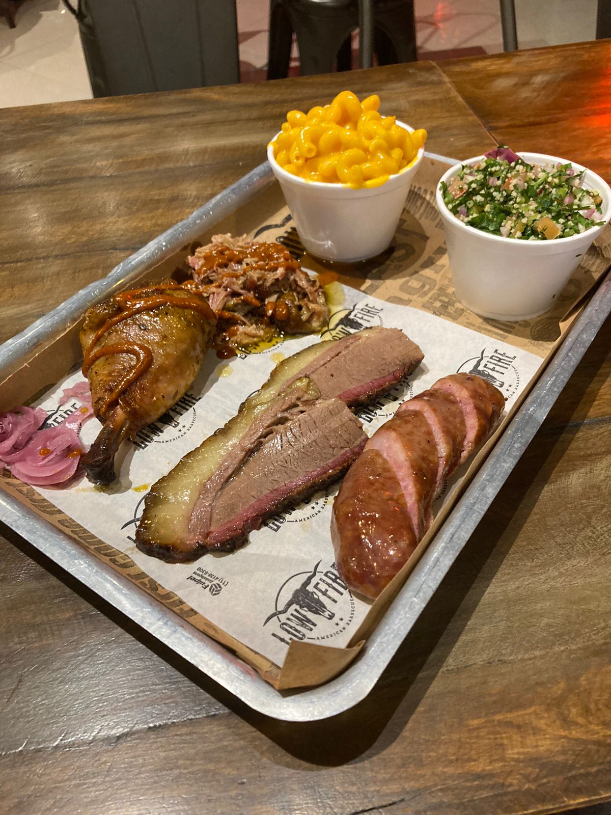 Fui fazer uma visita ao Centro Cultural Banco do Brasil (CCBB) durante a semana e quando saí encontrei um restaurante que não pude deixar de trazer para vocês. Localizado na Rua da Alfândega 7, Centro, a LowFire Smokehouse é uma casa especializada na culinária americana. O restaurante tem uma portinha escondida, mas ao entrar já vemos uma escadaria que leva a uma grata surpresa. Com um salão temático texano, o local serve o tradicional churrasco americano (American BBQ) e complementa seu cardápio com outros alimentos típicos da cultura norte-americana. O ambiente todo representa o país e o imaginário texano, com a bandeira desenhada na parede de madeira, bancos vermelhos em um balcão, além de um metal sanfonado na parede, que lembra contêineres. A iluminação um pouco mais baixa e o Led vermelho na parede com o nome do estabelecimento completam, em conjunto com a música, a ambientação texana.