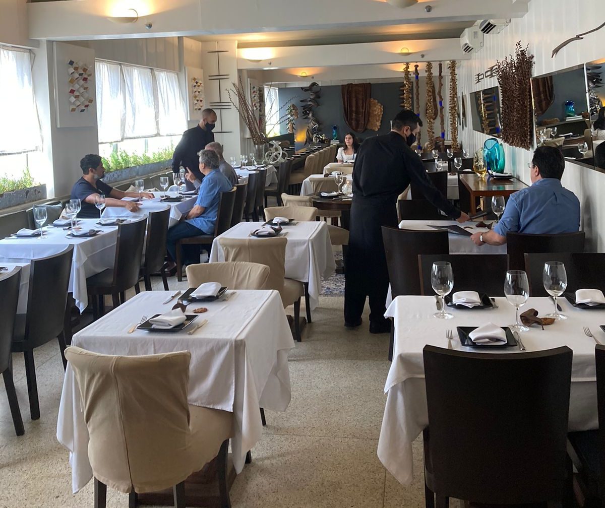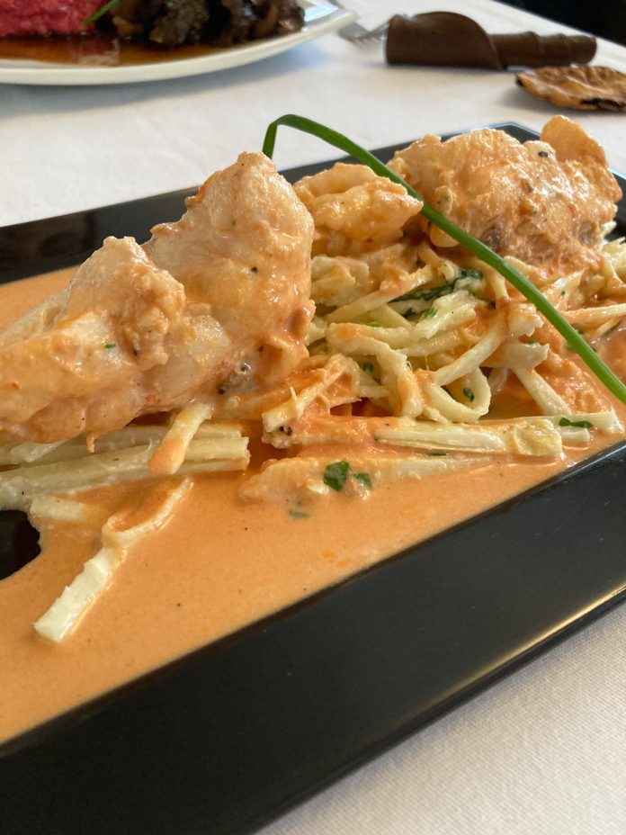 Minha visita foi marcada por um impacto já ao entrar, ao me deparar com a beleza e o tamanho do local, fato que não esperava por conta da modesta entrada já mencionada. Assim que sentei, já me foi servido como “amuse bouche”, um creme de batata com ervas, que estava bem quentinho e saboroso. Essa etapa de serviço, surge com a Nouvelle Cuisine francesa e vem antes da etapa da entrada, como uma carícia à boca. Esse creme de batata abre o apetite e logo em seguida já pedi a entrada sugerida pelo simpático chef Botinno Natale. Vale dizer que Natalle faz questão de ir às mesas cumprimentar seus clientes, além de se dispor a ajudar. A entrada que pedi para dividir com minha namorada foi o Brie recheado com tomate seco e trufa com molho Périgueux (R$ 43). O prato vem bem servido para dividir e é acompanhado de torradinhas. O gosto do queijo é bem presente e se destaca em relação ao gosto da trufa, que fica em segundo plano. As torradinhas estavam bem saborosas e quase todas crocantes. O tomate seco combina bem com todo o prato que tem seu sabor elevado por conta do molho Périgueux. Esse molho tem um delicioso gosto trufado e o vinho branco também se faz presente ao paladar. Nos pratos principais, segui a recomendação da casa e minha namorada foi em uma escolha própria. Os escolhidos para essa degustação foram a paleta de cordeiro no seu jus com risoto de beterraba assada e queijo de cabra (R$ 78), e a Cavaquinha grelhada, creme de lagostim com champagne e linguine de pupunha e ervas (R$ 79). O cordeiro estava muito bem temperado, com o gosto marcante das especiarias, e bem cozido, desfiando ao passar apenas o garfo. O risoto tinha o gosto bem presente de beterraba, que combina bem com a proteína. O ponto do arroz acabou passando um pouco, mas longe de ser um grande problema na avaliação final do prato. O jus de cordeiro estava com gosto bem concentrado de todo o tempero maravilhoso colocado na carne. A cavaquinha estava super macia e no ponto correto não só de cozimento como de tempero. O macarrão linguine de pupunha estava muito saboroso também, com o cozimento ao dente, além de um ótimo sabor das ervas. O molho de lagostim foi o ponto principal do prato, estava fantástico. De sobremesa, o Petit gateau de doce de leite (R$ 25) possuía a casquinha deliciosa oriunda da combinação da manteiga e açúcar na massa. O sorvete de chocolate belga completa com maestria o prato. A segunda sobremesa solicitada foi o Crocante de chocolate belga (R$ 27). Super bem servido, o doce se trata de um cremoso chocolate envolto em uma fina massa harumaki, acompanha sorvete de chocolate belga e coulis de fruta vermelha. O destaque aqui vai para a textura do chocolate, onde se era possível fazer um corte suave, lembrando um pouco a textura de um sorvete, porém servido quente. De bebida experimentei a Caipisake de abacaxi (R$ 26) bem leve e com o gosto da fruta presente ao final de cada gole. A Gin Tônica (R$ 27) também estava muito boa e vem com os aromatizantes tradicionais, zimbro e alecrim.