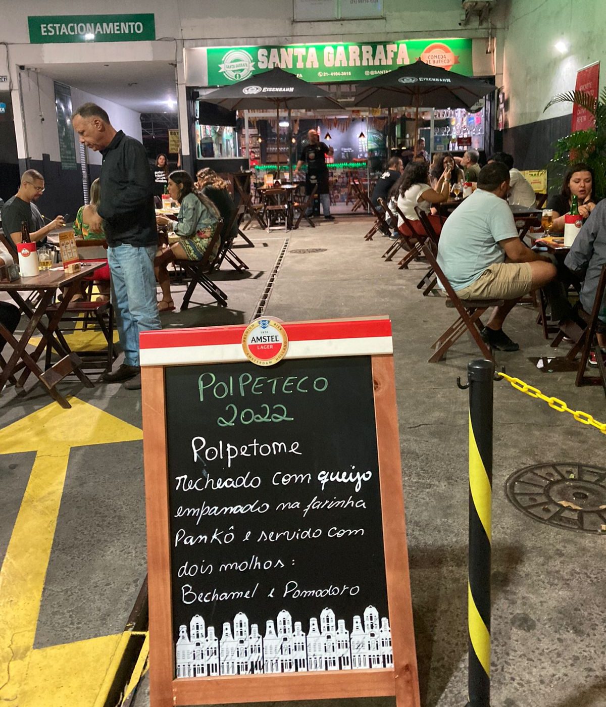O prato competidor da cervejaria Santa Garrafa é o Polpeteco (R$27), um polpetone recheado com queijo, sobre uma camada de molho Bechamel bem temperadinho, e com um molho de tomate e queijo maçaricado por cima. Para mim, o destaque positivo foi para o molho Bechamel nesse prato. No geral, foi um prato que me agradou e também uma boa ideia para competição, porém não foi o meu favorito. Ao meu ver, o gosto do queijo maçaricado ficou um pouco forte demais. Além disso, pedi um croquete de carne (R$9) que estava bem fritinho e carnudo. Para fechar a noite, pedi o Pig Estilizado (R$ 35), uma cestinha de massa de pastel temperada, recheada com barriga de porco cozida por 8 horas na cerveja Stout, queijo maçaricado por cima, alho torrado e pimenta biquinho para fechar. Dos 3 pratos da noite, esse foi o que menos gostei, a meu gosto um pouco salgado e com gosto de alho muito forte. O local localizado acoplado a um posto de gasolina, na Rua Teodoro da Silva 747, em Vila Isabel, serve as bebidas super geladas e tem excelente atendimento. Esse atendimento inclusive me passou uma dica valiosa: cliente, que paga com cartão Santander em qualquer estabelecimento concorrente no Comida di Buteco, ganha 10% de desconto no prato participante. O ambiente é todo voltado para o comércio de cervejas artesanais e tem em seu cardápio petiscos diferentes, como a linguiça recheada de provolone, e hambúrgueres artesanais, que além de bem gostosos, estão em uma ótima faixa de preço. Para quem gosta de explorar esses diversos sabores de cervejas, esse é um estabelecimento que vale a visita, independentemente, da competição em andamento.