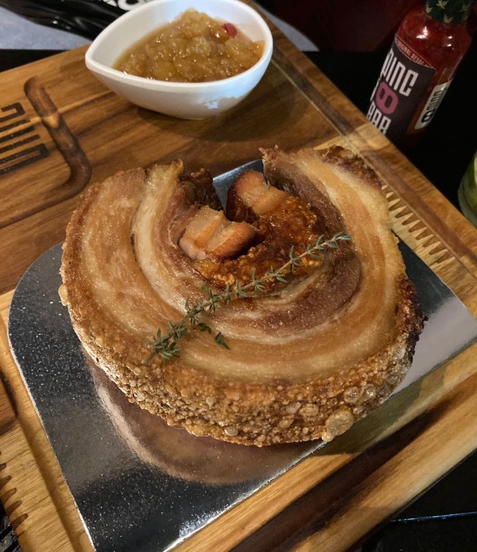 O atendimento foi muito bom, com garçons simpáticos e tudo muito modernizado, no qual os pedidos são enviados diretamente para a cozinha por meio de maquininhas. Para começar os trabalhos, aproveitei a dose dupla de uma maravilhosa caipirinha (R$ 16,90), que vai das 16 às 20 horas, de terça à quinta, e pedi uma coxinha de pernil com catupiry (R$ 7,90). A casa, que tem pratos à base de carnes suínas, serve também durante seu Happy Hour, dose dupla de chopp (R$ 12,90) até às 23 horas. Retornando à experiência gastronômica, devo dizer que a coxinha me fez retornar à infância com sua massa com gosto característico de festa. Pedi também uma pipoca de torresmo (R$ 11,90), que veio super quentinha e crocante em um copo americano lotado. Em seguida, provei também um pastel de camarão com bacon, alho poró e catupiry (R$ 7,90), com ótimo custo benefício por conta de seu tamanho e sabor. Para fechar, experimentei a novidade do local, o Barriga Cheia (R$ 34,90), uma panceta super saborosa e suculenta, recheada de queijo coalho e bacon que acompanhava uma geleia de abacaxi.