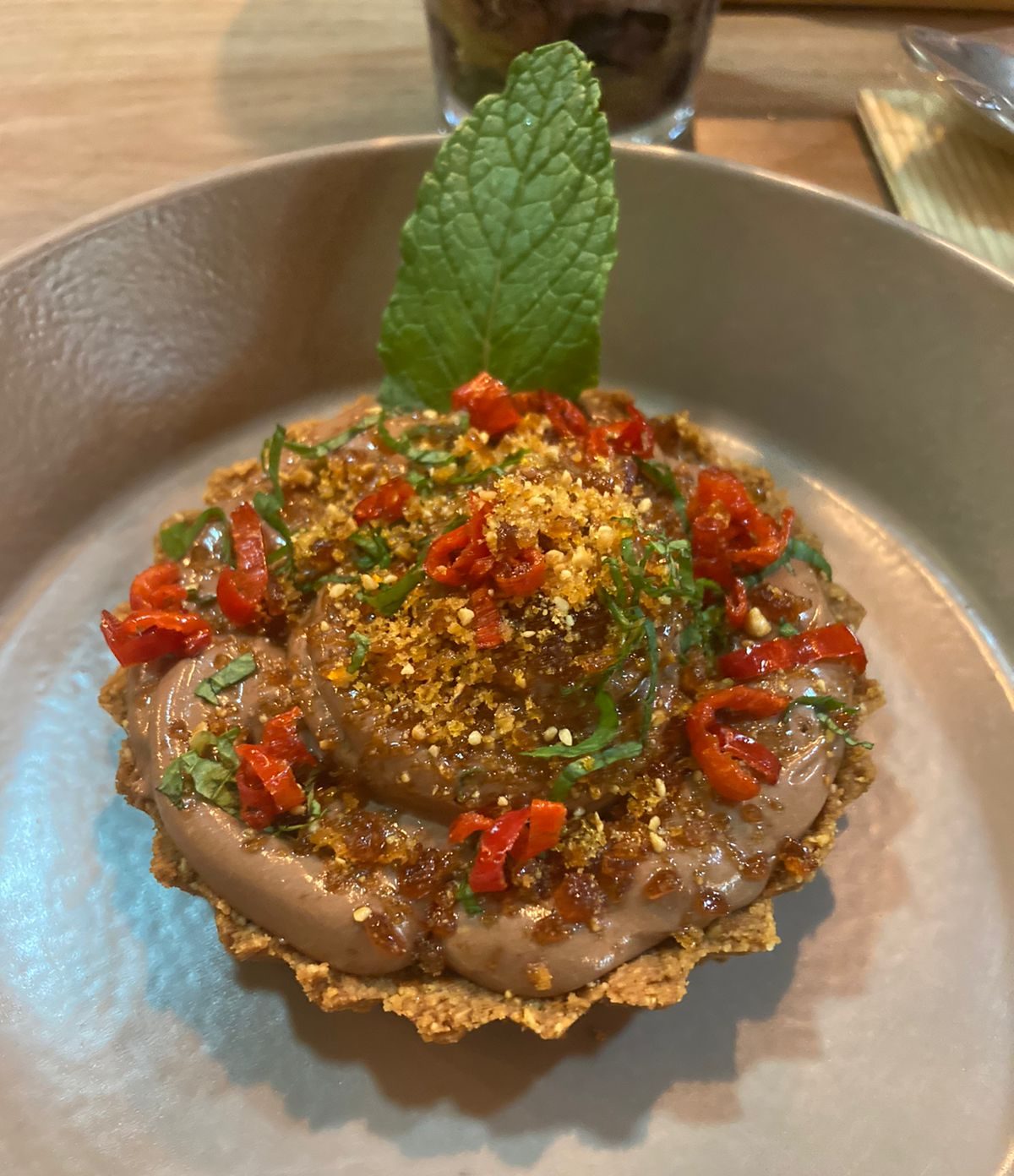 O Nasi Goreng é um prato da Indonésia com base de arroz frito e vegetais, tendo também uma pitada da famosa pimenta Sriracha. O arroz estava bem gostoso, apimentado na medida certa e com gosto dos legumes bem presentes. O prato tinha ainda um ovo frito com a gema mole super gostoso, e um lombinho suíno empanado, que além de crocante estava bem temperado e muito suculento. A sobremesa pedida foi a Tartelete de mousse de chocolate com crocante (R$ 25). A massa estava maravilhosa, assim como a mousse de chocolate super cremosa, que fica ainda melhor com os pedacinhos de caramelo por cima. Vale dizer que a casa oferece essa Tartelete com, ou sem pimenta, e eu recomendo que experimentem com. O tradicional casamento chocolate com pimenta deixa a sobremesa ainda mais gostosa, explora diferentes áreas sensoriais.