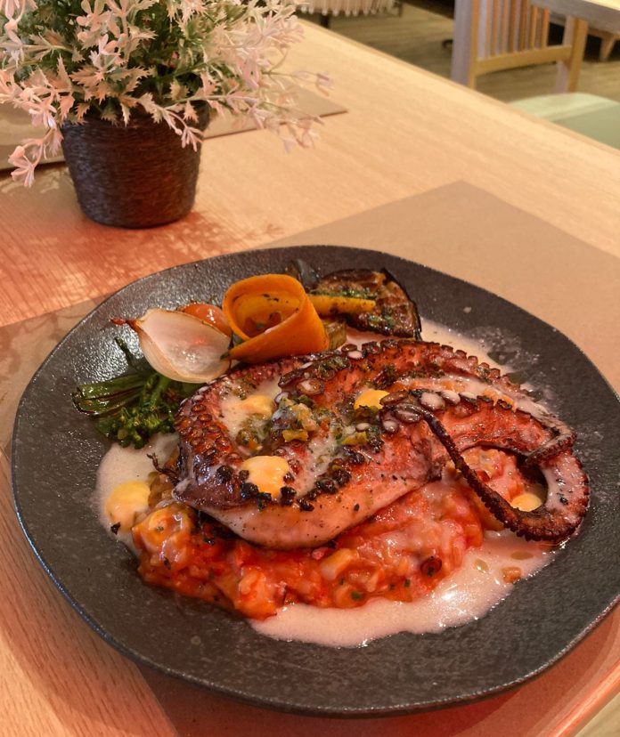 Para comer, comecei experimentando duas entradas, o Camarão ao alho (R$ 59), servido com vinagrete e molho tártaro, e o Ceviche (R$ 59).  O camarão veio com bastante alho e estava bem gostoso, apesar da quantidade de alho poder ser um pouco menor. O vinagrete estava muito bom e refrescante, o molho Tártaro é bem gostoso também, com o sabor do picles bem presente. Além disso, o prato vem com um pão bem crocante e quentinho, que o acompanhava muito bem. No geral é uma ótima entrada e condiz com a temática tropical do lugar. A segunda entrada também segue essa tendência e é muito refrescante. O cremosíssimo sorvete de manga servido com o peixe deixa o Ceviche ainda melhor. O leite de tigre, caldo resultante da cocção ácida do peixe, estava muito gostoso, sendo perceptível ao paladar os sabores dos temperos colocados, como coentro e pimenta dedo de moça. O sorvete auxilia a quebrar um pouco a acidez do ceviche, e torna o prato ainda mais equilibrado. Para beber, provei dois drinks muito bem feitos e diferentes, o Bee Queen (R$ 37), com gin, espuma de mel, limão e pólen de abelha, e o Mate Me Sede (R$ 35), com gin, mate e espuma cítrica. O Bee Queen é super leve e docinho, além de ter sabores específicos como o do pólen de abelha que completa o drink. O Mate Me Sede é o melhor drink que já tomei em restaurantes. O famoso mate da praia é elevado a outro patamar como drink, e recebe ainda uma deliciosa espuma de limão siciliano. Se você for ao Hills e quiser experimentar um pouco do que realmente é o Sabor Carioca, você deve pedir o Mate Me Sede. Seguindo minha degustação, fui para os dois pratos principais pensando em explorar, justamente, a terra e o mar. Pedi o Filé ao Hills (R$ 82), Filé Mignon com Brie ao molho Roti, com purê de batata e farofa, e o Polvo Tostado (R$ 92), temperado com chimichurri, acompanhado de arroz cremoso e legumes.  O filé veio no ponto solicitado, bem suculento e ainda com o Brie derretido por cima, que ornava muito no prato. O molho Roti era aveludado e muito saboroso. O purê de batata era mais rústico, mas mesmo assim era delicioso. Todos os legumes estavam bem cozidos, e com um sabor de tostadinho bem gostoso. O destaque dentre eles vai para a mini cenoura, que estava muito bem caramelizada por fora. Os legumes eram os mesmos presentes no prato do polvo, que possuía ainda um arroz cremoso muito gostoso. A meu ver o polvo por pouco não passou do ponto, mas mesmo assim estava bem temperado. O aioli, salvo engano de pimentão, que vinha junto, completava muito bem toda essa degustação.