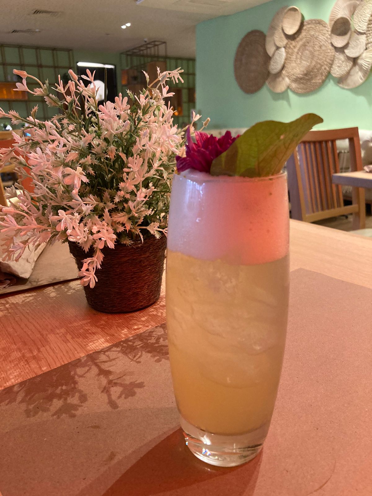 Entrando no restaurante, você já é muito bem recepcionado e consegue perceber uma escada para o Rooftop, que falarei mais tarde, e o salão com uma decoração que mistura terra e mar. As luminárias em formato de água viva feita por artesãos logo abaixo de uma claraboia são simplesmente lindas. As cores do restaurante são tropicais, com um verde bem clarinho e tons amadeirados no chão e nas cadeiras. Fora isso, os painéis de plantas, sofás super confortáveis e luzes de Led completam essa ambientação incrível. A música ambiente é brasileira e contribui com o ar tropical e toda brasilidade do local. O salão conta ainda com um palco para shows, que acontecem depois das 20 horas para quem estiver no restaurante.